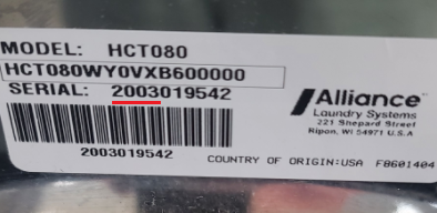 Prices not changing on machine | If the prices configured for the reader using the Portal are not reflecting on the actual reader or machine, check the serial number of the machine. If it starts with 2001, 2002, or 2003 (as shown below), then these models DO NOT ALLOW the reader to control the pricing (Alliance disabled this during production models in Q1 2020); you'll need to configure pricing directly on the washer/dryer. |