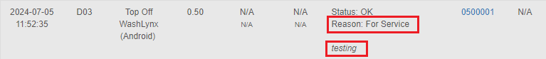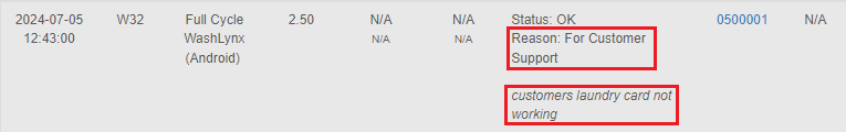 When viewing these transaction in the Card Tracker's Usage Report tab, you will see the reason that was selected for this specific machine start as well as any notes that were included when the machine was started: