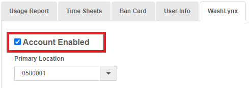 Navigate to the WashLynx tab and click on the Account Enabled check box to enable this WashLynx account:
