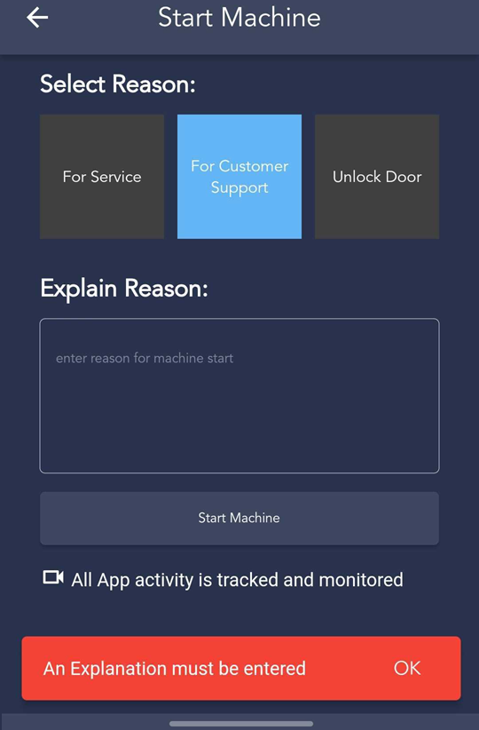 When attempting to start a machine, the WashLynx app will ask for the account holder to give a reason for starting that machine.