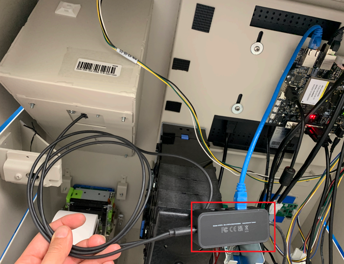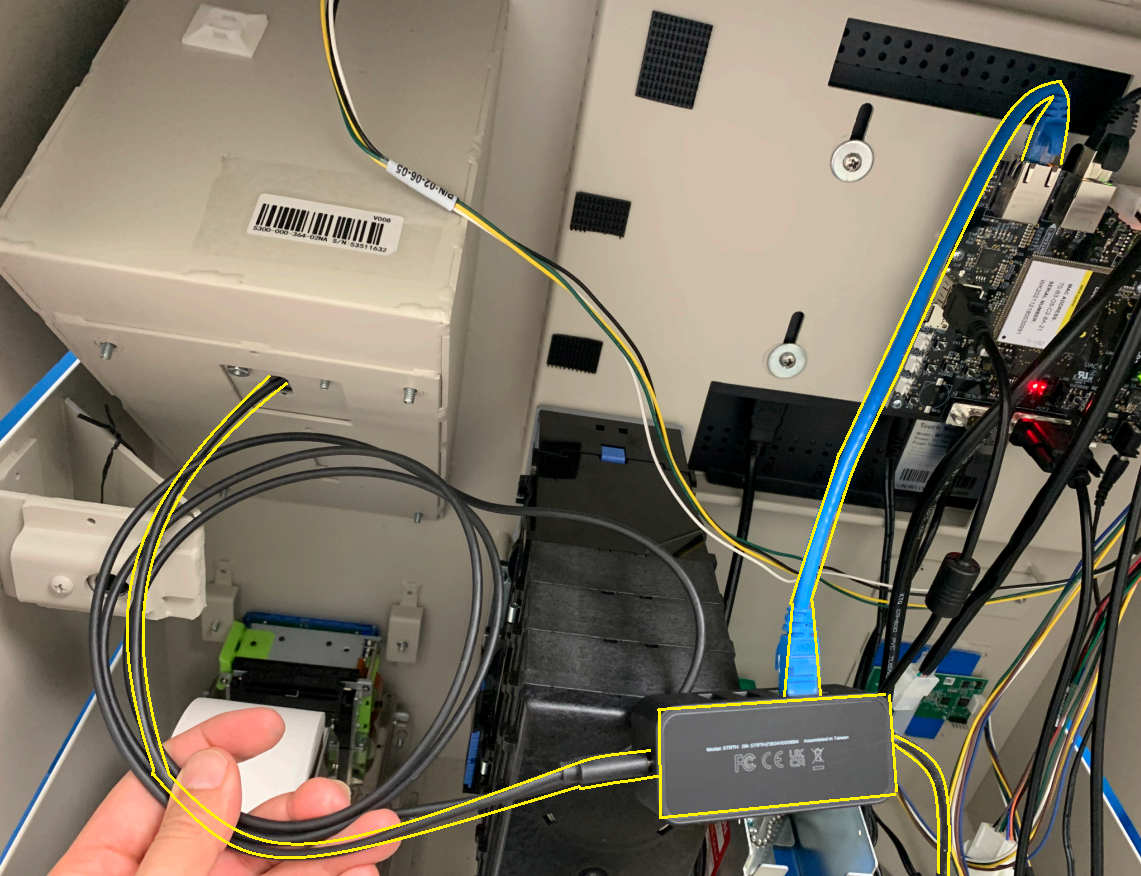 Essentially the PINpad terminal only connects to the VAC's main control board's AUX1 Ethernet Port, via the short blue Ethernet cable that's already plugged into it;