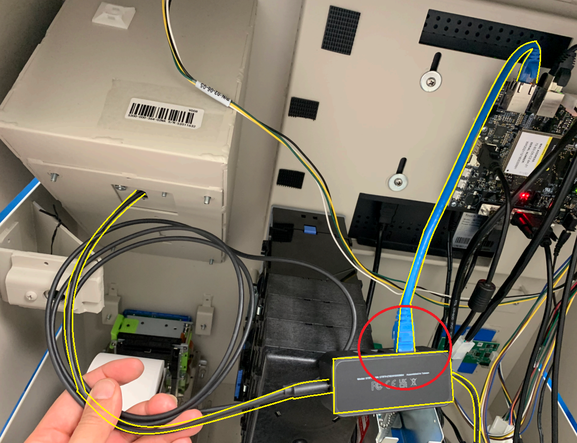 The PINpad terminal's ethernet cable needs to be plugged into the ethernet port on, the VAC control board, labelled "AUX1"